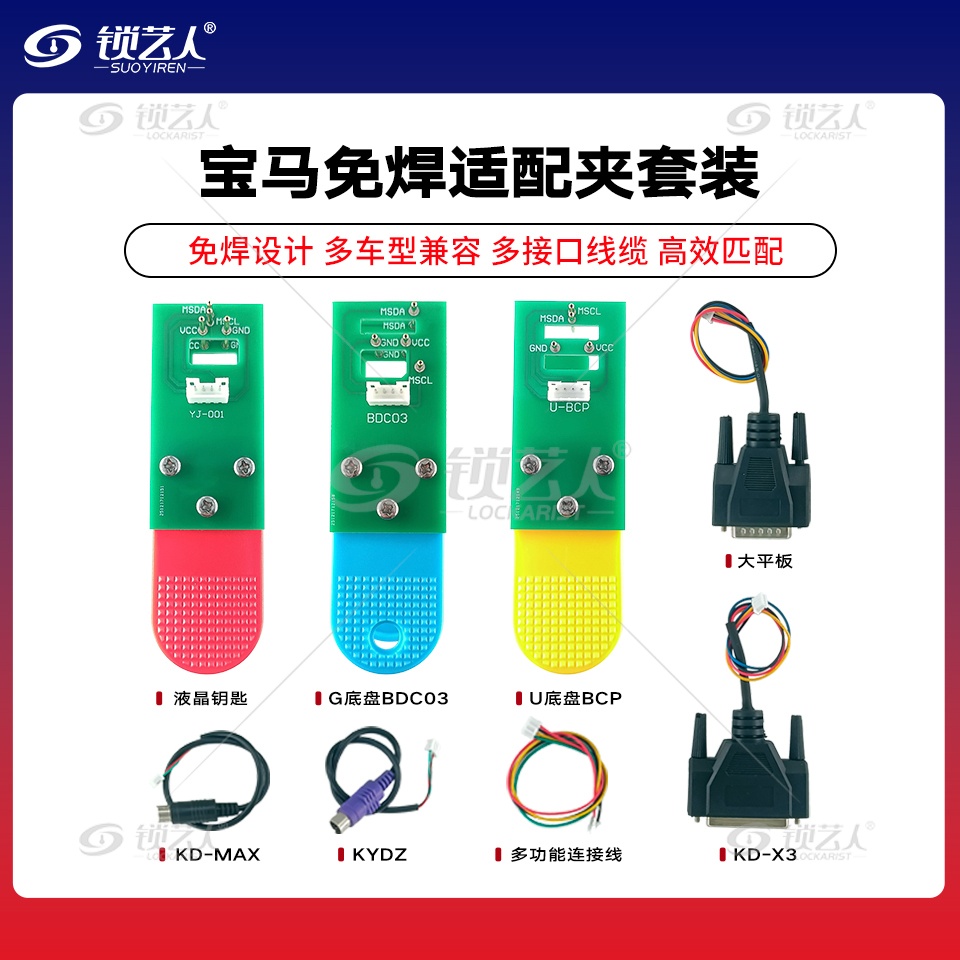 宝马免焊钥匙适配夹三件套,专为汽车电子维修与钥匙匹配设计。包含G底盘BDC03、U底盘BCP及液晶钥匙三种免焊夹,搭配多功能连接线、KYDZ、KD-MAX、KD-X3、大平板等多种连接线。免焊线设计,操作便捷高效,支持原厂钥匙读取与烧录,助力技师快速完成钥匙匹配与数据处理。